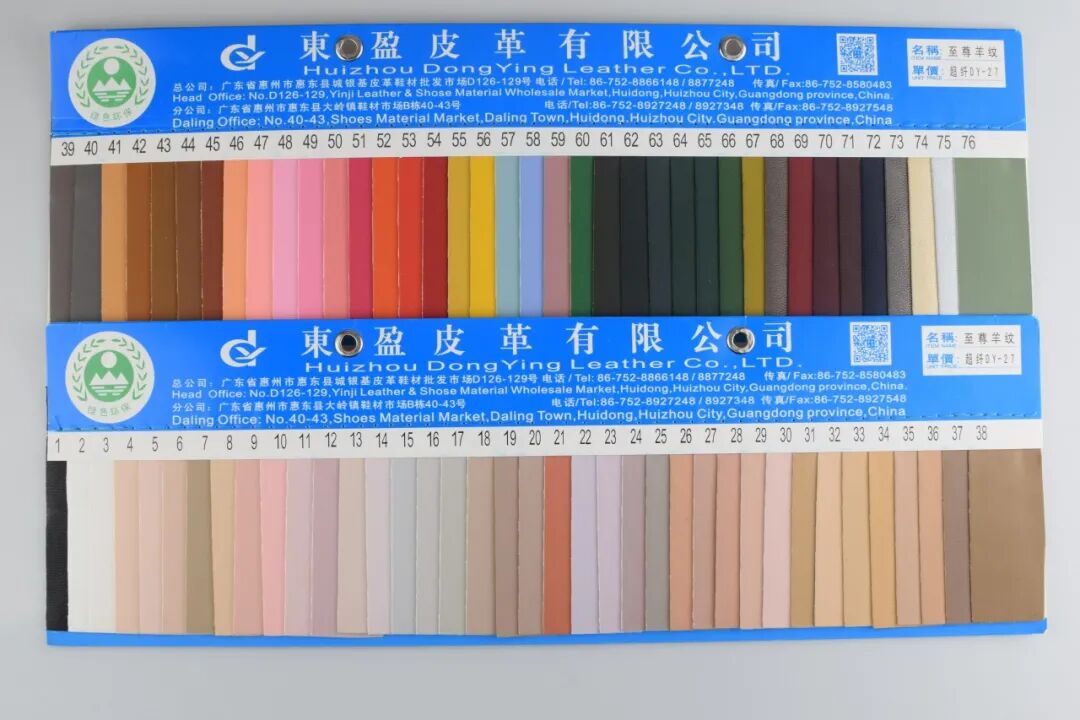 东盈这款至尊羊纹超纤:0.7 mm厚度,皮质感极强,韧性好,拉力强,手感柔软而极富弹性,颜色多达1-76个颜色。